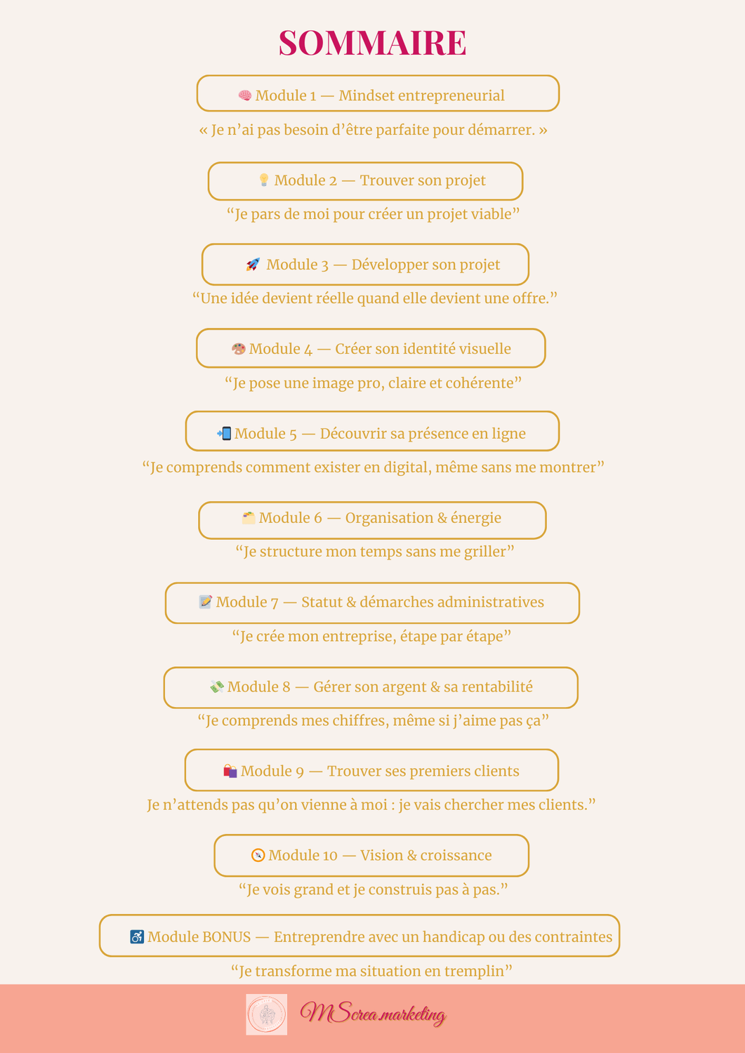 Créer ton offre, structurer ta méthode, construire un tunnel clair et une stratégie simple pour vendre dès maintenant.
